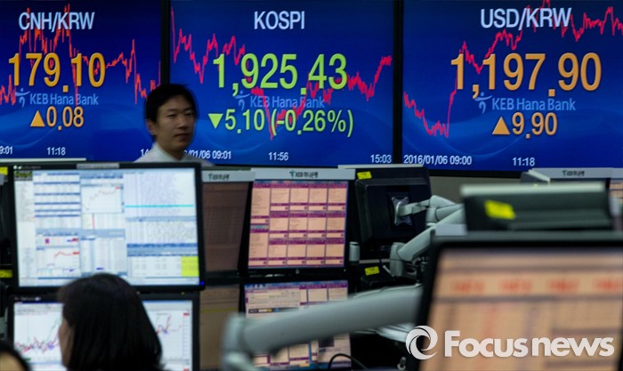 (서울=포커스뉴스) 코스피 지수가 전거래일 보다 5.10포인트(0.26%) 하락한 1,925.43에 거래를 마치며, 북한의 수소탄 실험에도 1920선을 지킨 6일 오후 서울 중구 KEB하나은행 본점 딜링룸에서 딜러들이 업무를 보고 있다. 이날 원달러 환율은 전거래일 보다 9.9원 오른 1197.9원에 마감하며, 지난해 9월 1200.9원 이후 4개월 만에 최고치를 기록 했다.