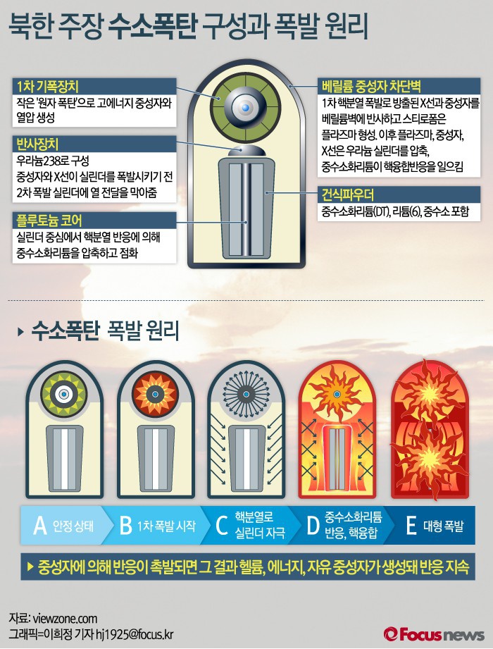 <포커스뉴스>는 수소폭탄의 원리를 그래픽으로 정리했다.(서울=포커스뉴스) 북한이 6일 시험에 성공했다고 발표한 수소폭탄은 수소의 원자핵이 융합해 살상·파괴용으로 이용되는 폭탄이다. 2016.01.06 이희정 기자송은경 기자