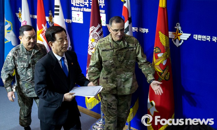 (서울=포커스뉴스) 한민구 국방부 장관과 이순진 합참의장, 커티스 스캐퍼로티 주한미군사령관이 7일 오전 서울 용산구 국방부에서 북한 수소탄 실험에 대한 한미 양국 공조 방안을 발표한 뒤 브리핑룸을 나서고 있다.