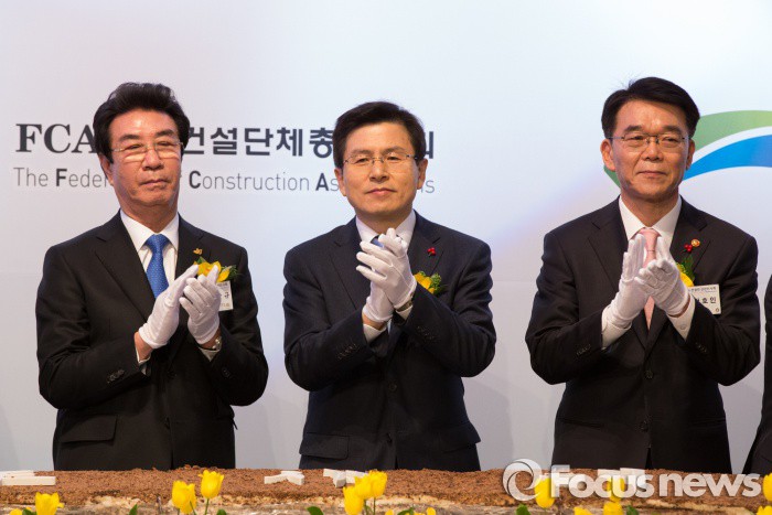 (서울=포커스뉴스) 황교안 국무총리가 7일 오후 서울 중구 롯데호텔에서 열린 2016 건설인 신년인사회에 참석해 시루떡을 자른 후 박수를 치고 있다. 왼쪽부터 최삼규 대한건설단체총연합회장, 황교안 국무총리, 강호인 국토교통부 장관.
