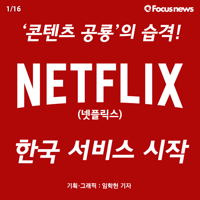 (서울=포커스뉴스) 지난 1월 7일, 세계적인 콘텐츠 기업 '넷플릭스(Netflix)'가 한국 서비스를 시작했습니다. 1개월 무료라는 이점을 내세워 한국 소비자들이 쉽게 접할 수 없었던 콘텐츠들을 제공하고 있는데요. 넷플릭스가 이미 한국 내에도 다수 존재하는 'OTT(Over the top)' 서비스 시장에 어떤 변화를 가져올 지, 카드뉴스를 통해 함께 예상해 보시죠.