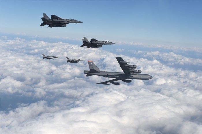 (서울=포커스뉴스) 북한의 수소폭탄 실험 이후 미국의 핵우산 제공 방침에 따라 미 공군의 전략 폭격기가 한반도로 전개한 10일 B-52 폭격기와 우리 공군의 F-15K, 미군 F-16 전투기가 한반도 상공을 날고 있다. <사진제공=공군>