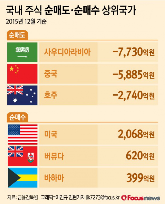 (서울=포커스뉴스) 16일 금융감독원이 발표한 ‘2015년 12월 외국인 증권투자 동향’에 따르면 사우디아라비아 국적자가 국내 상장 주식을 가장 많이 팔아 최대 순매도국인것으로 나타났다.