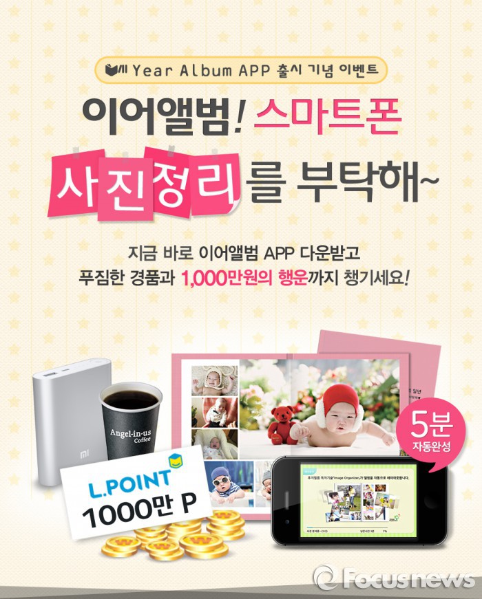 해당 앱으로 편집한 앨범을 장바구니에 담으면 매주 100명에게 롯데통합포인트인 L.포인트 1만원을 적립하고, 앨범을 실제로 구매하면 추첨을 통해 100여명에게 총 1000만원 상당의 포인트를 추가로 제공한다.한국후지필름은 포토북 서비스 '이어앨범'의 모바일 앱을 출시하고 이벤트를 진행한다. <사진=한국후지필름>