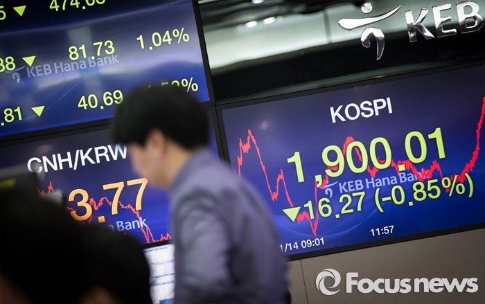 코스피가 하루만에 1880선까지 밀려나며 상승세를 유지하는데 (서울=포커스뉴스) 14일 오후 서울 중구 KEB하나은행 딜링룸에서 직원들이 업무를 보고 있다. 오늘 하락 출발한 코스피가 1890선을 중심으로 횡보하다 마감직전 1900선에 턱걸이하며 전일대비 16,27포인트(0.85%) 떨어진 1900.01에 마감, 코스닥 지수는 전일대비 2.84포인트(0.41%) 내린 683.19에 거래를 마쳤다.