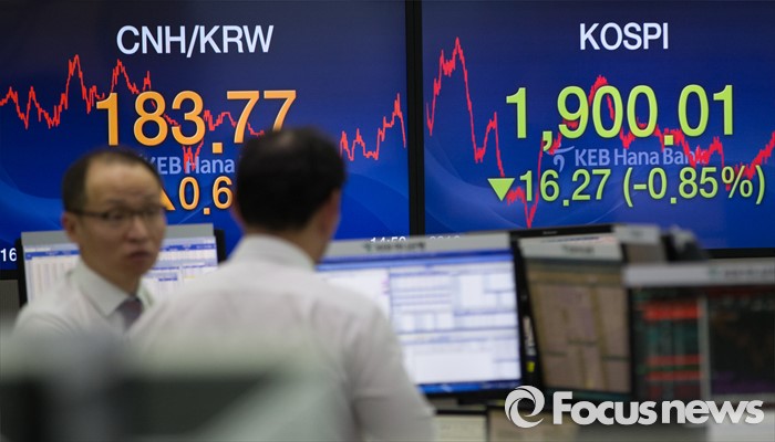 코스피가 하루만에 1880선까지 밀려나며 상승세를 유지하는데 (서울=포커스뉴스) 14일 오후 서울 중구 KEB하나은행 딜링룸에서 직원들이 업무를 보고 있다. 오늘 하락 출발한 코스피가 1890선을 중심으로 횡보하다 마감직전 1900선에 턱걸이하며 전일대비 16,27포인트(0.85%) 떨어진 1900.01에 마감, 코스닥 지수는 전일대비 2.84포인트(0.41%) 내린 683.19에 거래를 마쳤다.