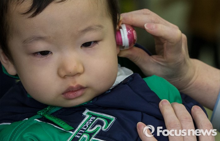 (서울=포커스뉴스) 인플루엔자 유행주의보가 발령된 15일 오전 서울 용산구 소화아동병원에서 한 어린이가 체온을 측정하고 있다.