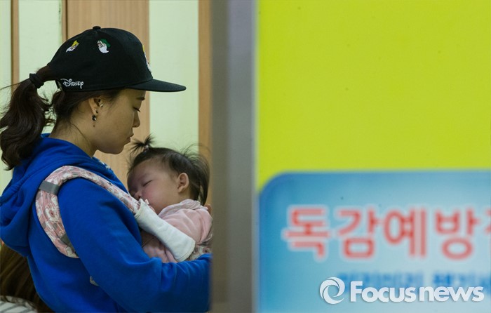 (서울=포커스뉴스) 인플루엔자 유행주의보가 발령된 15일 오전 서울 용산구 소화아동병원에서 한 엄마가 자녀와 진료 차례를 기다리고 있다.