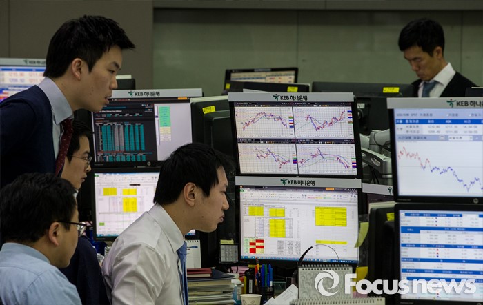 (서울=포커스뉴스) 코스피 지수가 중국 경제에 대한 불안감과 국제유가 하락 등의 여파로 전 거래일 대비 0.42포인트(0.02%) 하락한 1878.45로 마감한 18일 오후 서울 중구 KEB하나은행 딜링룸에서 딜러들이 환율 상황을 점검 하고 있다. 이날 원달러 환율은 전 거래일보다 1.5원 하락한 1,210.9원, 원위안 환율은 전거래일보다 0.63원 오른 183.93원에 장을 마쳤다.