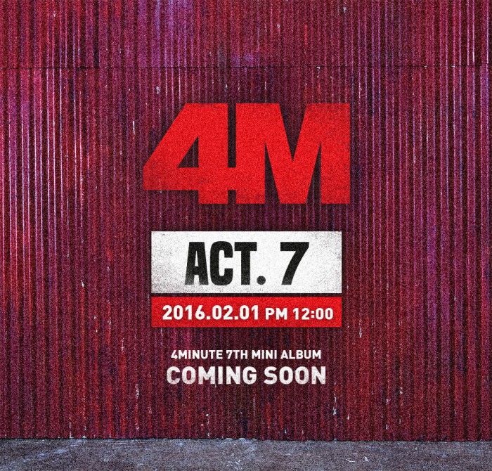 소속사 큐브엔터테인먼트는 20일 "포미닛이 미니 7집 '액트 세븐(Act.7)'을 2월1일 발표하고 5인 완전체로 컴백한다"고 밝혔다. 지난해 2월 '미쳐(Crazy)' 활동 이후 1년여 만의 컴백이다. 포미닛은 큐브엔터테인먼트 공식 소셜네트워크서비스(SNS) 계정으로 컴백을 알리는 티저 이미지도 공개했다.