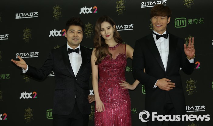 (서울=포커스뉴스) 20일 서울 동대문구 경희대학교 평화의 전당에서 열린 제 30회 골든디스크 시상식에 참석한 방송인 전현무(왼쪽부터)와 가수 서현, 김종국이 포토타임을 갖고 있다.