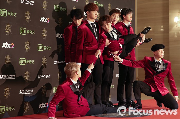 (서울=포커스뉴스) 21일 서울 동대문구 경희대학교 평화의 전당에서 열린 제 30회 골든디스크 시상식에 참석한 아이돌그룹 비투비가 포토타임을 갖고 있다.