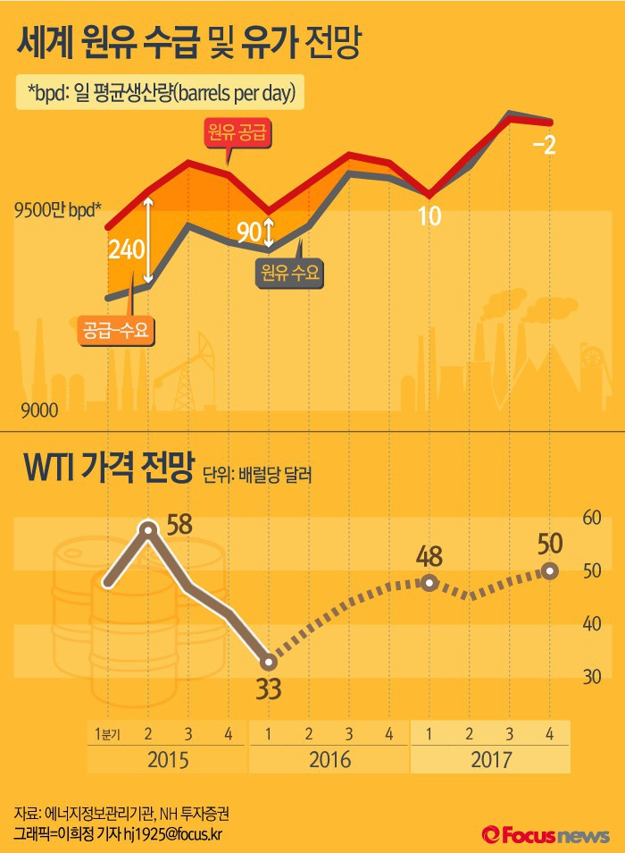증권사의 한 거시 분석가도 “연초 거시 변수들을 추세로 반영하면 한은의 3.0% 성장률 전망치는 사실상 불가능에 가깝다”며 “경제주체들이 위축된 상황에서 대규모 재정 동원이나 통화정책 완화도 그다지 효과가 없을 것”으로 내다봤다.<자료출처=한국은행>(서울=포커스뉴스) 공급 과잉과 수요둔화로 국제 유가의 끝없는 추락이 이어지면서 향후 유가가 어떤 변화를 나타낼지 관심사다. 국제에너지기구(IEA)에 따르면 세계 원유 공급은 최소 내년까지 현재 수준을 초과할 것이란 전망이다. 원유의 공급과 수요의 균형이 맞춰지면 유가는 안정권에 접어들 것으로 보인다.2016.01.25 이희정 기자