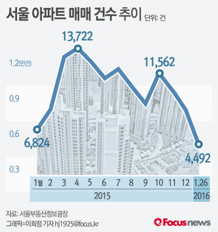 (서울=포커스뉴스) 26일 서울부동산정보광장에 따르면 1월 서울 아파트 매매 건수는 26일까지 4,492건으로 하루 평균 172.8건이 성사됐다. 이는 전달보다 34.9% 줄어든 것으로 지난해 같은 달과 비교해도 21.5% 감소했다.