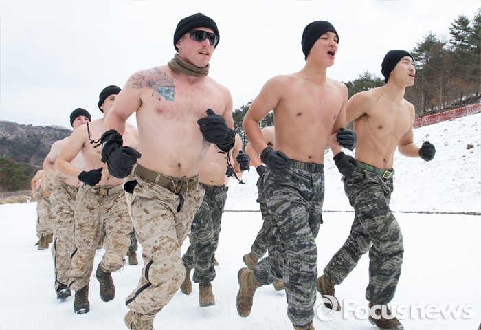 (평창=포커스뉴스) 28일 강원도 평창군 황병산 해병대 산악 종합훈련장에서 열린 '한·미 해병대 연합 동계 설한지 훈련'에 해병대 수색대대와 미 해병대 3사단 수색중대 장병들이 참가하고 있다.