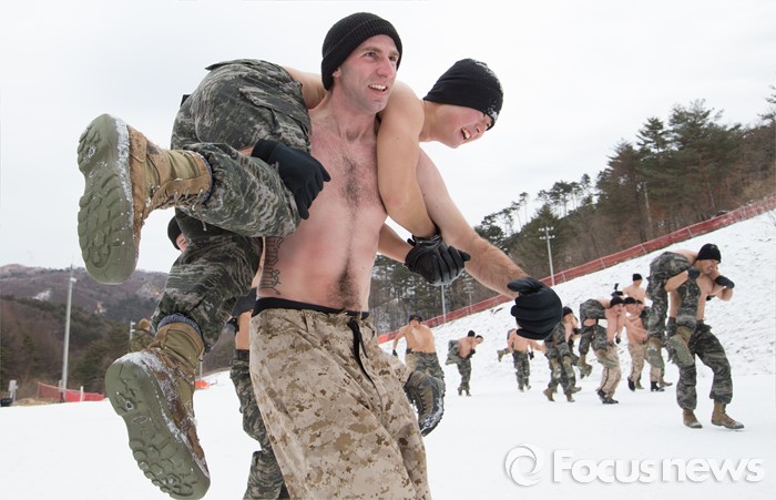 (평창=포커스뉴스) 28일 강원도 평창군 황병산 해병대 산악 종합훈련장에서 열린 '한·미 해병대 연합 동계 설한지 훈련'에 해병대 수색대대와 미 해병대 3사단 수색중대 장병들이 참가하고 있다.