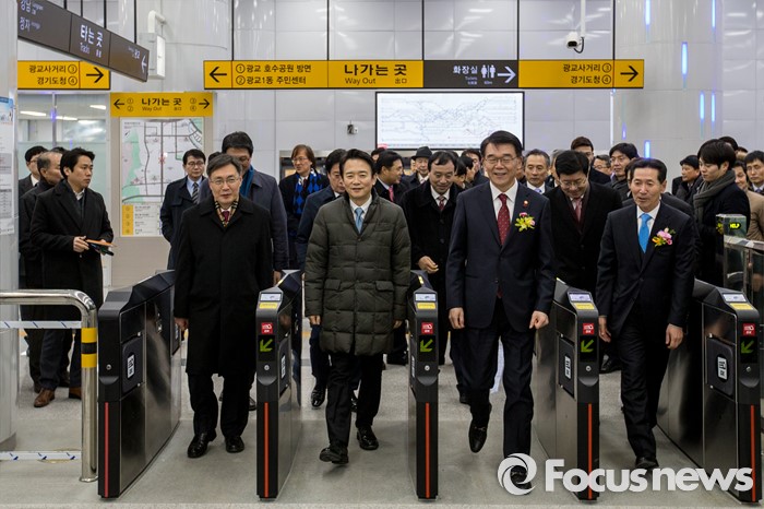 (수원=포커스뉴스) 강호인(오른쪽 두 번째) 국토교통부 장관과 남경필(오른쪽 세 번째) 경기도지사를 비롯한 주요내빈들이 29일 오후 경기도 수원시 영통구 신분당선 광교중앙역에서 열린 '정자-광교 복선전철 개통행사'를 마친 뒤 시승하기 위해 전철로 이동하고 있다.