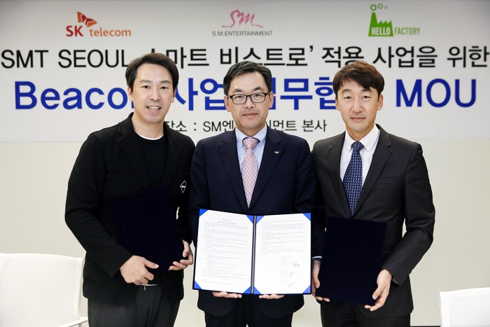 SK텔레콤은 최진성 종합기술원장과 SM엔터테인먼트 김영민 대표, 공동 연구개발사인 김경민 헬로팩토리 대표가 참석한 가운데, 서울 삼성동 SM엔터테인먼트 본사에서 ‘IoT 레스토랑’ 서비스 개발을 위한 양해각서(MoU)를 체결했다고 31일 밝혔다.