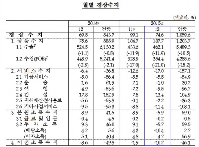 한은 측은 "에너지류를 제외할 경우 작년 12월 수입은 11.7% 감소, 연중치로는 4.9% 감소했을 것으로 추정된다"고 말했다.2015년 12월 경상수지.<자료제공=한국은행>