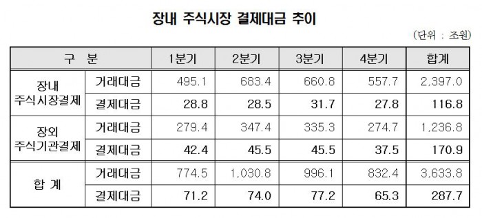 (서울=포커스뉴스) 한국예탁결제원은 지난해 예탁원을 통한 증권결제대금 중 주식결제대금 총액이 287조7000억원(일평균 1조2000억원)을 기록, 전년동기 대비 5.5% 증가했다고 4일 밝혔다.