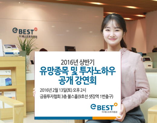(서울=포커스뉴스) 이베스트투자증권은 오는 13일 오후 2시 금융투자협회에서 ‘2016년 상반기 유망종목 및 투자노하우 공개 강연회’를 개최한다고 11일 밝혔다.