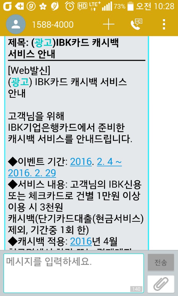 광고 내용은 'IBK카드 캐시백 서비스 안내'로, 기업은행에서 발급받은 체크카드로 결제하거나 단기카드대출을 받을 경우 일정 금액을 돌려준다는 내용이다.