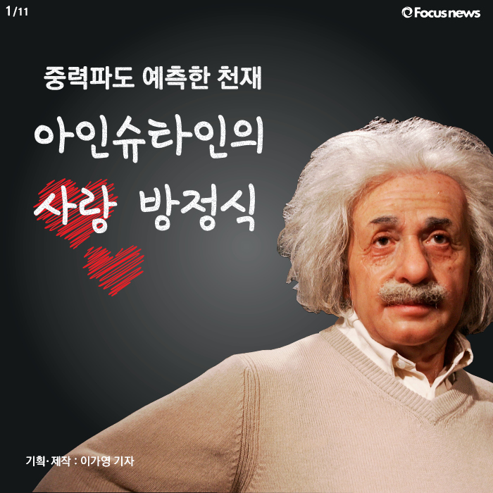 (서울=포커스뉴스) 지금으로부터 꼭 100년 전 1916년. 아인슈타인은 일반상대성이론을 통해 ‘중력파’를 예측했고, 2016년 2월 11일 과학자들은 이를 직접 확인했습니다. 이런 천재 아인슈타인이 수학으로 풀어낸 사랑방정식이 있다는 것, 아시나요? 나이가 들어도 어렵기만 한 사랑을 천재는 어떻게 정리했는지 카드뉴스로 확인해보시죠.