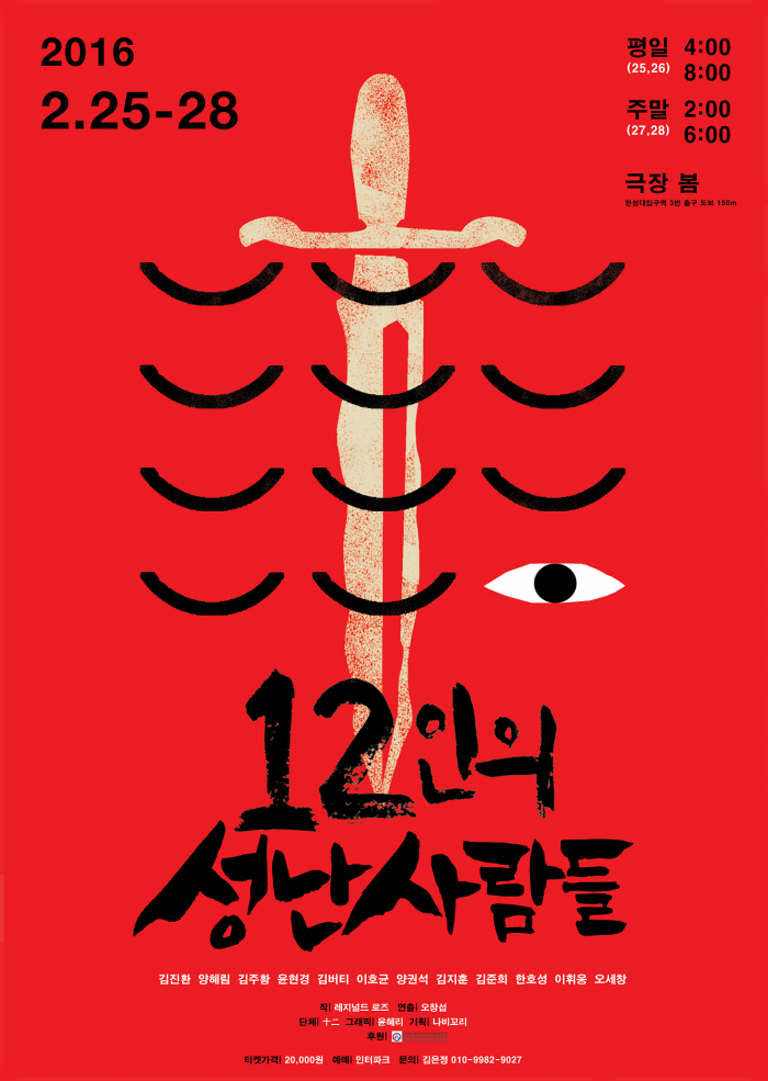 연극 '12인의 성난 사람들'은 오창섭이 연출을 맡았으며 배우 김진환, 양혜림, 김주황, 윤현경, 김버티, 이호균, 양권석, 김지훈, 김준희, 한호성, 이휘웅, 오세창 등이 출연한다. 기획은 나비꼬리가 맡았다. 예매는 인터파크, 티켓 가격은 2만원이다.연극 '12인의 성난 사람들' 포스터.<사진제공=극단 십이>