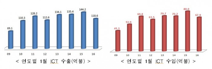 최재유 미래부 제2차관은 “향후 ICT 부문별 현장 방문 등을 실시하고 수출 및 해외 진출 활성화 방안을 마련하는 한편 ICT 수출 활성화 추진단을 구성해 주요품목별 담당자 지정을 통해 수출현황을 점검하고 개선사항을 지속적으로 발굴하겠다”고 밝혔다.연도별 1월 ICT 수출 현황.<그래프제공=미래부>