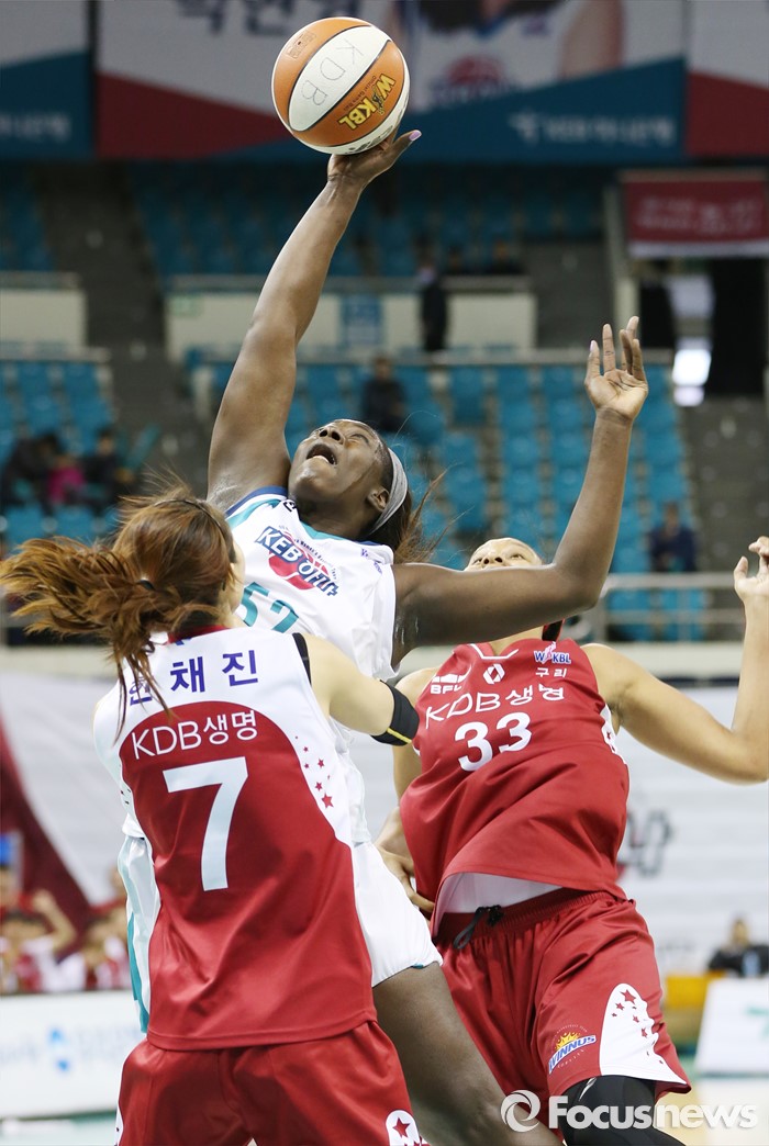 KEB하나은행은 외국인선수 모스비가 24득점 5리바운드로, 첼시 리가 16득점 10리바운드로 활약했다. 김이슬도 3점슛 2개 포함, 10득점을 올렸다. KDB생명은 이경은이 3점슛 4개 포함 14득점을 기록했지만 외국인선수 플레넷(10득점 9리바운드)과 비키바흐(2득점 4리바운드)가 부진하며 연패를 끊지 못했다.(부천=포커스뉴스) 29일 부천체육관에서 열린 2015-2016 여자프로농구 KEB하나은행-KDB생명 경기에서 KEB하나은행 첼시 리가 KDB생명 한채진과 플레넷을 제치고 리바운드볼을 잡고 있다. 2015.11.29 우정식 기자