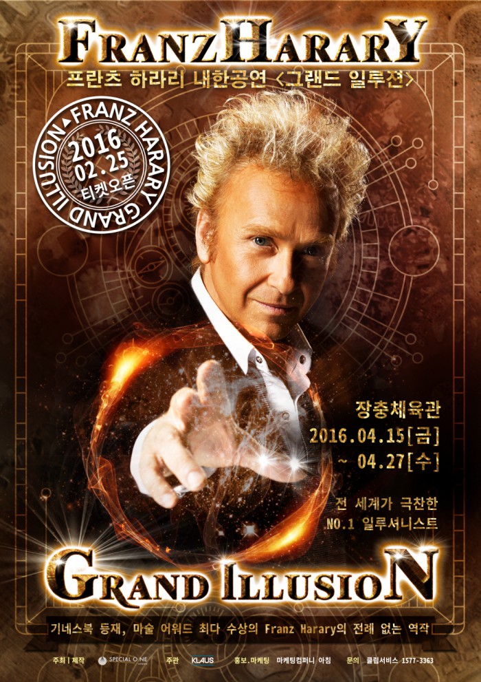 '그랜드 일루젼(Grand Illusion)'은 오는 4월15일부터 27일까지 서울 중구 장충체육관에서 열린다. 인터파크, YES24 등에서 오는 25일부터 예매할 수 있다.세계적 일루셔니스트 프란츠 하라리가 오는 4월15일부터 27일까지 장충체육관에서 내한공연 '그랜드 일루젼'을 연다. 사진은 공연 포스터. <사진제공= 마케팅컴퍼니아침>