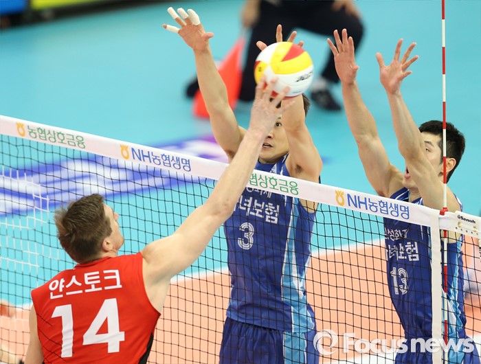 (수원=포커스뉴스) 23일 수원실내체육관에서 열린 '2015-2016NH농협 V-리그' 남자부 한국전력-삼성화재 경기에서 삼성화재 최귀엽과 이선규가 한국전력 얀 스토크의 연타 공격에 블로킹을 대고 있다.