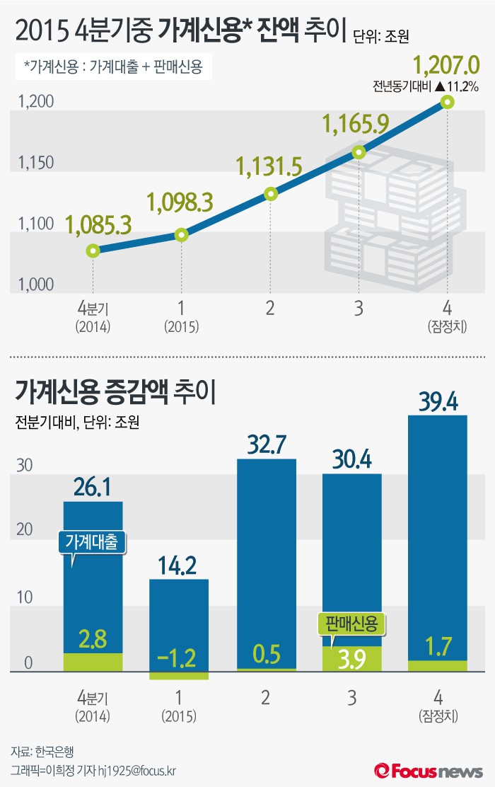 (서울=포커스뉴스) 24일 한국은행이 발표한 '201년 4분기 중 가계신용(잠정)'에 따르면 가계신용 잔액은 지난해 말 1207조원으로 2002년 4분기 통계 작성 이후 최대치를 기록했다. 이는 전분기 1166조원 대비 3.5%(41.1조원), 전년 동기 1085조3000억원 대비 11.2%(121조7000억원) 증가한 수준이다.