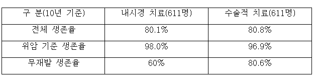 그 결과 10년 전체 생존율은 내시경 치료 그룹이 80.1%, 수술 그룹이 80.8%으로 유의미한 차이를 보이지 않았다.