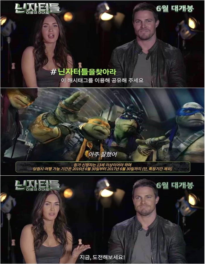 영화 '닌자터틀: 어둠의 히어로'에 출연한 배우 메간 폭스와 스테판 아멜이 등장하는 이벤트 영상이 25일 공개됐다. 영상에서는 메간 폭스와 스테판 아멜이 "닌자터틀 사총사가 전세계 몇몇 도시에 나타난다. 이들과 함께 촬영한 인증샷을 SNS에 해시태그 '#닌자터틀을찾아라'를 달아 공유하면 닌자 터틀의 고향인 미국 뉴욕 VIP여행권에 당첨된다"고 특별이벤트 내용을 설명하고 있다.