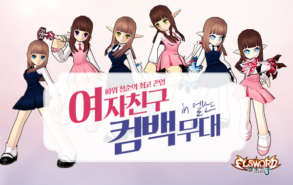 여자친구는 2월 현재 음악 방송 1위의 12관왕을 달성하는 대기록을 세우고, 최근 음원차트 4주 연속 1위 등 화제를 모으고 있는 인기 걸그룹이다. 보다 자세한 사항은 공식 홈페이지(elsword.nexon.com)에서 확인 할 수 있다.엘소드의 '여자친구' 아바타 <사진제공=넥슨>
