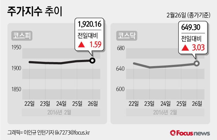 (서울=포커스뉴스) 26일 코스피지수는 전날 보다 0.08%(1.59포인트) 오른 1920.16에 장을 마쳤다. 코스닥지수는 전일 대비 0.47%(3.03포인트) 오른 649.30에 마감했다.