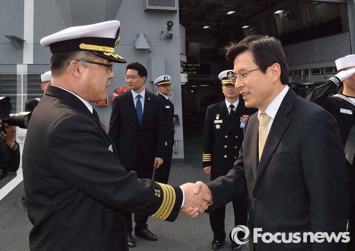 (서울=포커스뉴스) 황교안(오른쪽) 국무총리가 26일 오후 제주 서귀포 제주해군기지에서 열린 제주민군복합형관광미항 준공식에 참석해 이지스구축함 서애류성룡함에서 관계자와 악수하고 있다. <사진제공= 해군>