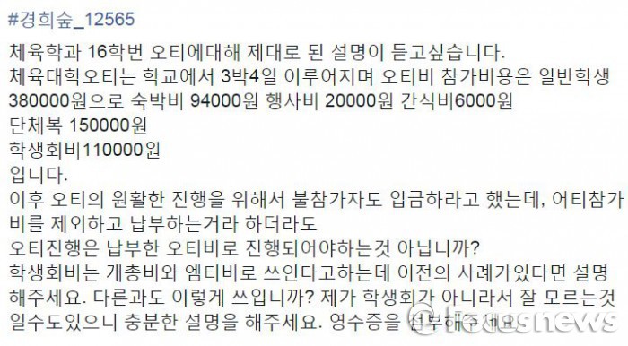 지난 14일 밤 페이스북 경희대 대나무숲 페이지에 ‘체육학과 16학번 OT에 대해 제대로 된 설명이 듣고 싶다’는 내용의 글이 올라오면서 경희대 체육대학 'OT비 논란'이 시작됐다.