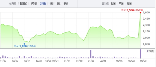 29일 오전 10시20분 현재 큐브엔터테인먼트는 전일 대비 무려 595원(29.82%) 상승한 2590원에 거래되고 있다.