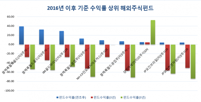 해외주식투자전용펀드는 이들을 취급하는 증권회사와 펀드온라인코리아, 은행․보험회사 등 총 48개 금융회사에서 가입이 가능하다2016년 이후 성과가 가장 우수한 해외 펀드는 금 관련투자였다. 원자재 변동성과 함께 수익률 변동성도 컸다.(자료제공=한국펀드평가사)5년 전 투자했다면 한화글로벌헬스케어 펀드로 90% 가까운 수익률을 보여주고 있다. 안정적인 성과를 보여주는 펀드로는 삼성아세안펀드다.(자료제공=한국펀드평가사)'텔레커뮤니카시인도네시아'는 2015년부터 주가는 꾸준히 상승했다. <삼성아세안증권> 펀드가 가장 많이 비중을 둔 인도네시아 국영기업이다(자료제공=텔콤 홈페이지)