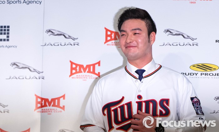 일반적으로 투수와 타자가 처음 만나면 투수가 유리하다. 타자가 상대 투수의 구종, 구속 등 정보를 알고 있어도 비디오로 겪는 것과 타석에서 체감하는 것은 전혀 다르다. 투구궤적을 이미지트레이닝했더라도 타석에 서면 또다르다. 박병호는 스프링캠프 메이저리그 투수들의 공을 보고는 '정직한 패스트볼'이 없다고 했다. 상대 투구에 움직임과 구위에 상당히 날카롭다는 것을 뜻한다.(서울=포커스뉴스) 미네소타 트윈스에 입단한 박병호가 7일 오전 서울 서대문구 그랜드힐튼호텔에서 기자회견을 열고 메이저리그 진출에 대한 소감과 포부를 밝힌 뒤 미네소타 트윈즈 유니폼을 입고 포즈를 취하고 있다. 2016.01.07 성동훈 기자