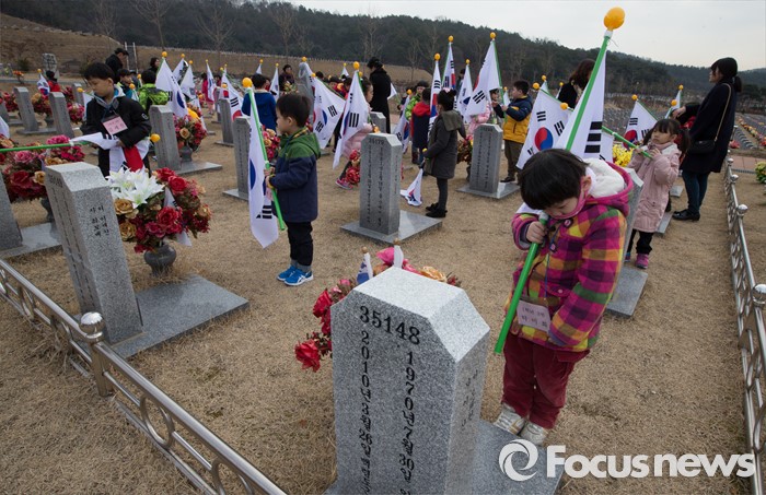 (대전=포커스뉴스) 3일 오전 입학 후 첫 수업에 들어간 대전 화정초등학교 1학년 신입생들이 대전 유성구 국립대전현충원 천안함 46용사 묘역을 찾아 묵념하고 있다.