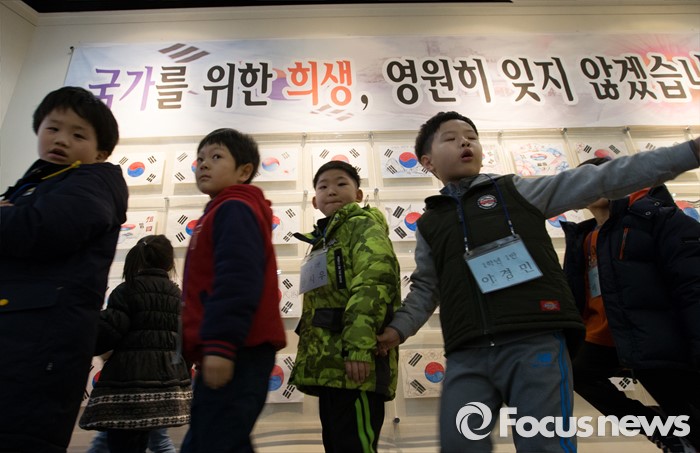 (대전=포커스뉴스) 3일 오전 입학 후 첫 수업에 들어간 대전 화정초등학교 1학년 신입생들이 대전 유성구 국립대전현충원 천안함 46용사 묘역 참배를 마치고 보훈미래관 내부 전시물을 관람하고 있다.