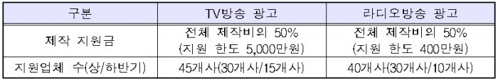 중소기업 방송광고 제작지원 사업은 혁신형 중소기업에 대해 TV광고는 5000만원, 라디오광고는 400만원까지 방송광고 제작비의 50%를 지원해 주는 사업이다. 올해는 TV광고 제작 45개사, 라디오광고 제작 40개사 등 85개 중소기업에 대해 총 24억1000만원의 광고제작비를 지원할 계획이다.