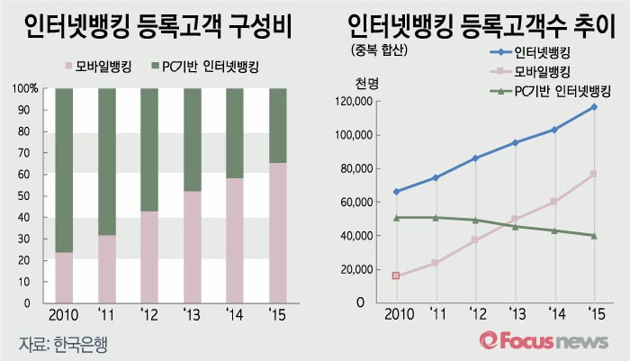 (서울=포커스뉴스) 3일 한국은행이 발표한 ‘2015년중 국내 인터넷뱅킹서비스 이용현황’에 따르면, 지난해 말 기준 인터넷뱅킹서비스에 등록한 고객 수(중복합산)는 1억1685만명으로 2014년 말보다 13.2% 늘어났다. 스마트폰기반 모바일뱅킹에 등록한 고객 수가 6479만명으로 전년 말 대비 34.4% 증가해 전체 증가세를 주도한 것으로 나타났다.