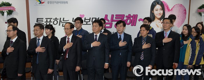 (과천=포커스뉴스) 3일 오후 경기도 과천시 중앙선거관리위원회에서 열린 '아름다운 선거 홍보대사 위촉식'에서 직원들이 국기에 대한 경례를 하고 있다.