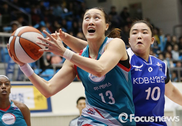 (구리=포커스뉴스) 3일 구리시체육관에서 열린 2015~2016 여자프로농구 KDB생명- KEB하나 경기에서 KEB하나 김정은이 KDB생명 최원선의 마크를 뚫고 레이업슛을 시도하고 있다.