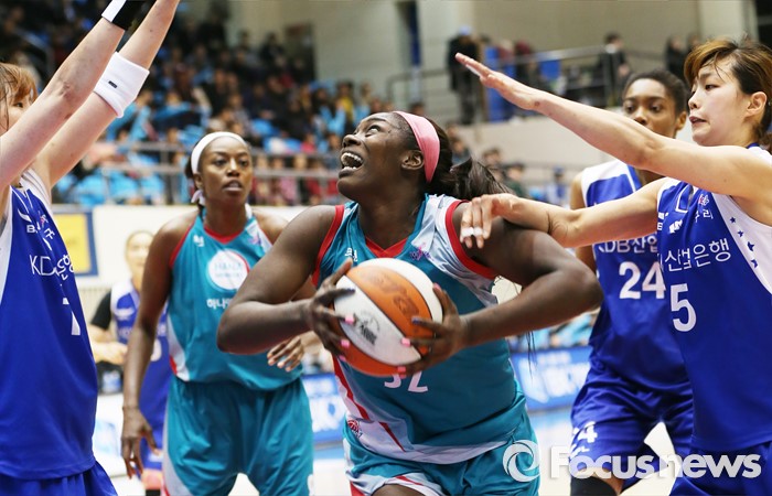 (구리=포커스뉴스) 3일 구리시체육관에서 열린 2015~2016 여자프로농구 KDB생명- KEB하나 경기에서 KEB하나 첼시 리가 KDB생명 이경은과 조은주의 더블팀 속에서 골밑슛을 노리고 있다.