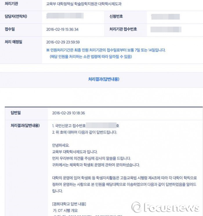해당 글은 경희대 학생이 국민신문고에 경희대 체대 OT비 논란과 관련해 민원을 제기한 글에 대해 교육부 대학학사제도과에서 민원처리를 한 내용이다.